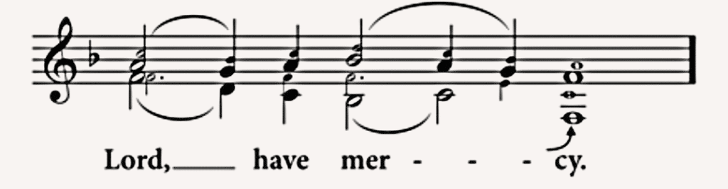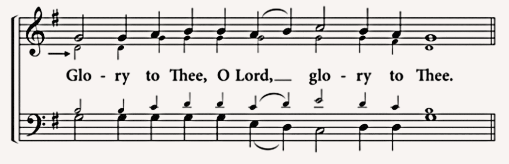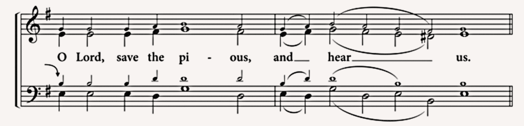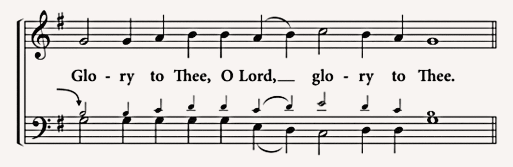 Singing only melody and bass is one option if that is what available forces permit. However, if the singers are available, it is customary to add a descant, which usually takes the form of a parallel third either above or below the melody. At the head of each staff I have included small courtesy notes in order to indicate the location of the descant—i.e., above or below the melody—as well as to help the choir director or cantor know what pitches to give the singers before starting. If the descant is above the melody (by far the more common circumstance) the upper courtesy note will be higher than the starting note of the melody; if the descant is below the melody, the upper courtesy note will be the same as the starting note of the melody.