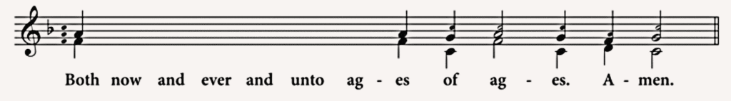 However, while all the music in this volume is printed on one staff in either one or two voice-parts, this does not mean that this is necessarily a book of unison or two-part music. Many of the melodies contained herein — Common Chant and Kievan Chant, for example — were likely never meant to stand alone, but were customarily harmonized according to simple four-part formulas. Slavonic obikhods of previous centuries usually contained only a single melodic line, and singers were expected to harmonize the chant melodies by ear. This is a reasonable expectation where there exist well-established traditions of harmonized singing, but in English-speaking North America, where Orthodox faithful are often either clinging to the vestiges of a tradition that only their grandparents knew firsthand, or are encountering this tradition for the first time as adults, harmonizing chant melodies at sight can be challenging. In order to make adding harmony to the melodies in this book easier, I have included a functional bass part for all the chants that are customarily harmonized. After the melody, therefore, the bass may be added as a supporting part and as a guide for inferring the rest of the harmonies.