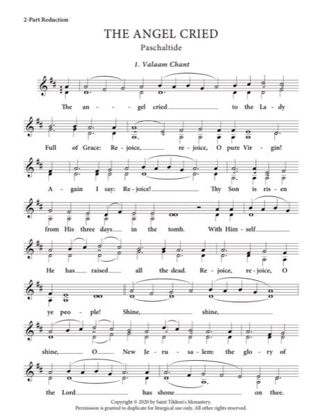 Chapter from A Common Book of Church Hymns: Divine Liturgy. The Hymn to the Theotokos at Pascha. Includes Valaam and Greek chant settings. Minimum 2 copies.