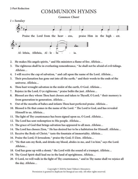 From A Common Book of Church Hymns: Divine Liturgy. Common chant setting with text for various Communion hymns, including each day of the week, for the departed, and major feasts, such as the feasts of the Theotokos/Meeting of the Lord, Exaltation of the Cross/other feasts of the Cross, Nativity of the Lord, Theophany, Annunciation, Lazarus Saturday, Palm Sunday, Pascha, St. Thomas Sunday, Mid-Pentecost, Ascension, Pentecost, and Transfiguration.